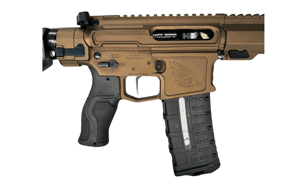 The lower receiver includes an integrated folding system which allows the whole buffer system to fold to the side, creating a compact profile for easy storage and carry. The lower receiver is equally optimized, featuring ambidextrous safety controls for left- and right-handed shooters. A TriggerTech Duty Trigger provides a consistent, crisp break, while the FAB Defense Gradus grip, designed with a reduced angle, minimizes wrist strain for greater comfort during extended shooting sessions. To round out the build, we include the SBA4 pistol brace, delivering stability and control in a compact footprint.