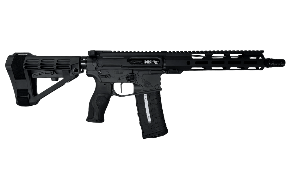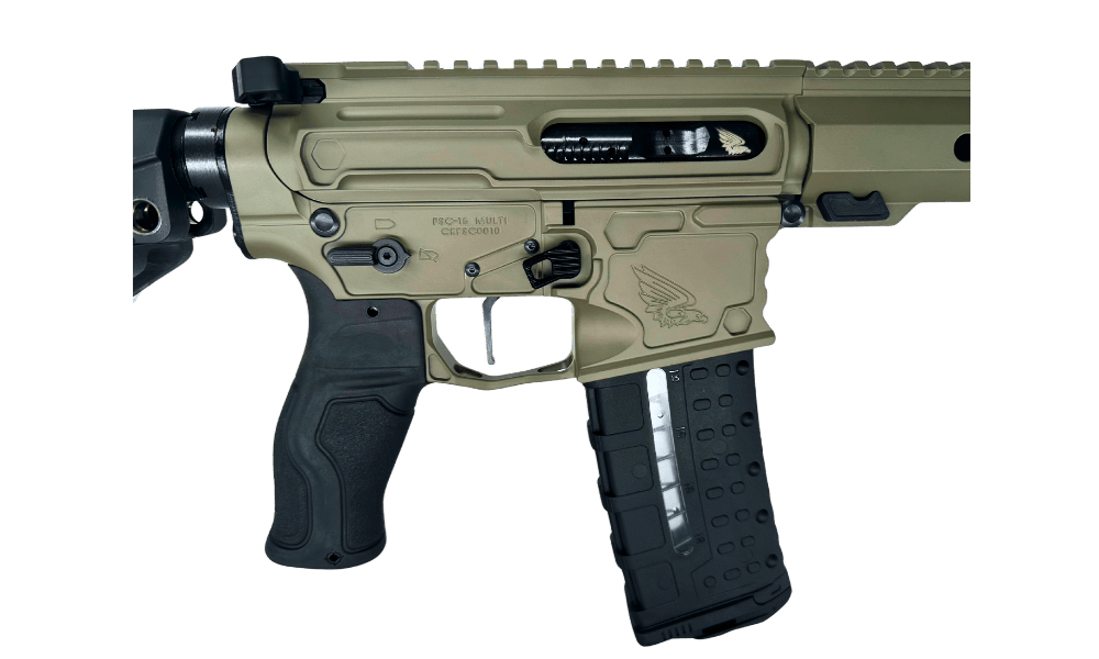 Our custom Glock 19 Gen 5 slides are designed with aggressive angles and windows. The front of the slide has been given a deep angular cut for a unique muzzle profile. Along the sides of the slide are several triangle window cuts as well as cuts on top of the slide allowing for a reduction in weight and air flow to the barrel.